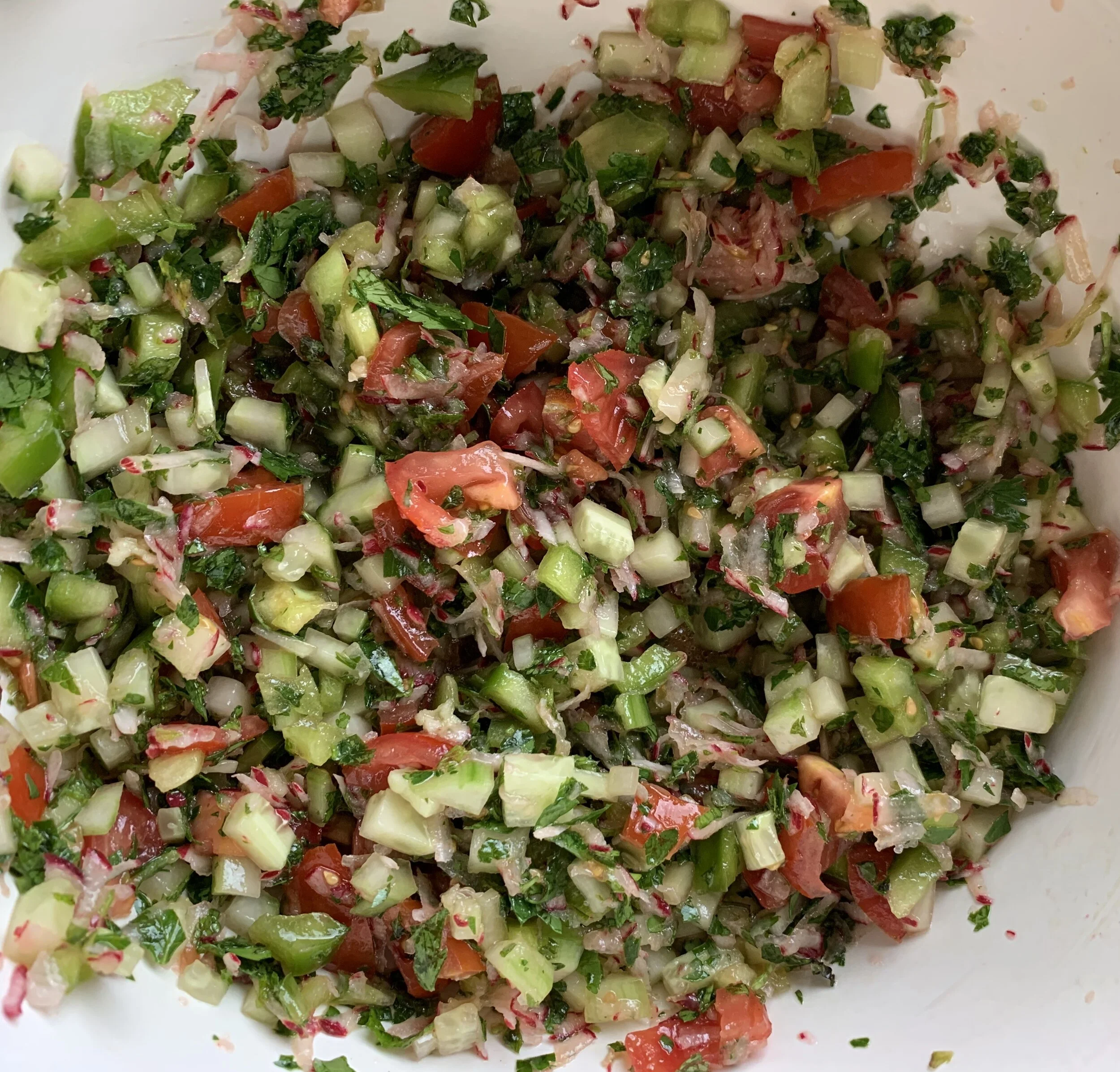 Finely dice pepper, cucumber, tomato; chop parsley and mint