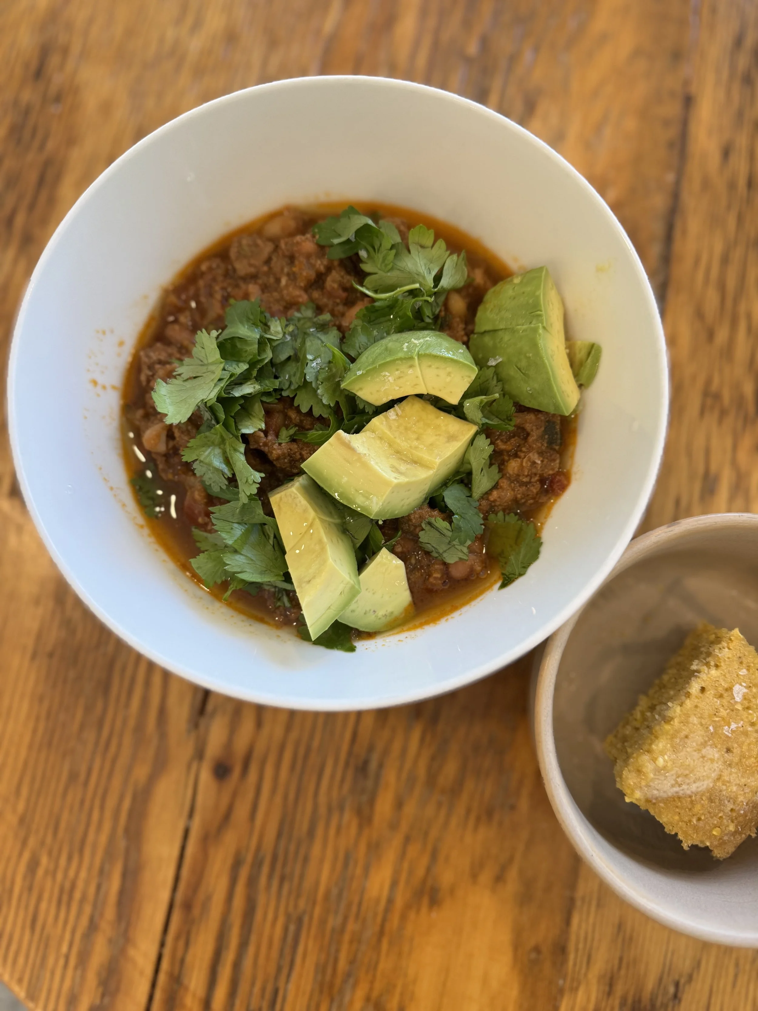 Ladle the chili into bowls and garnish with avocado slices and cilantro. I love serving this with Siete corn tortilla chips or GF cornbread.